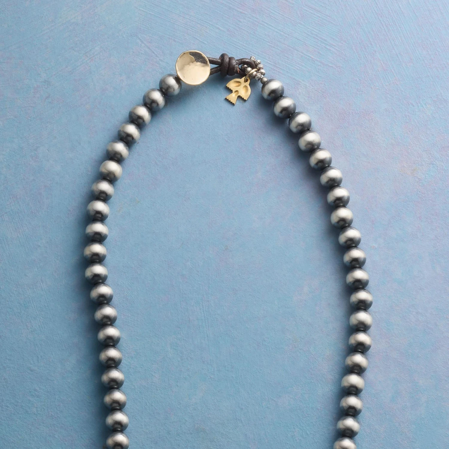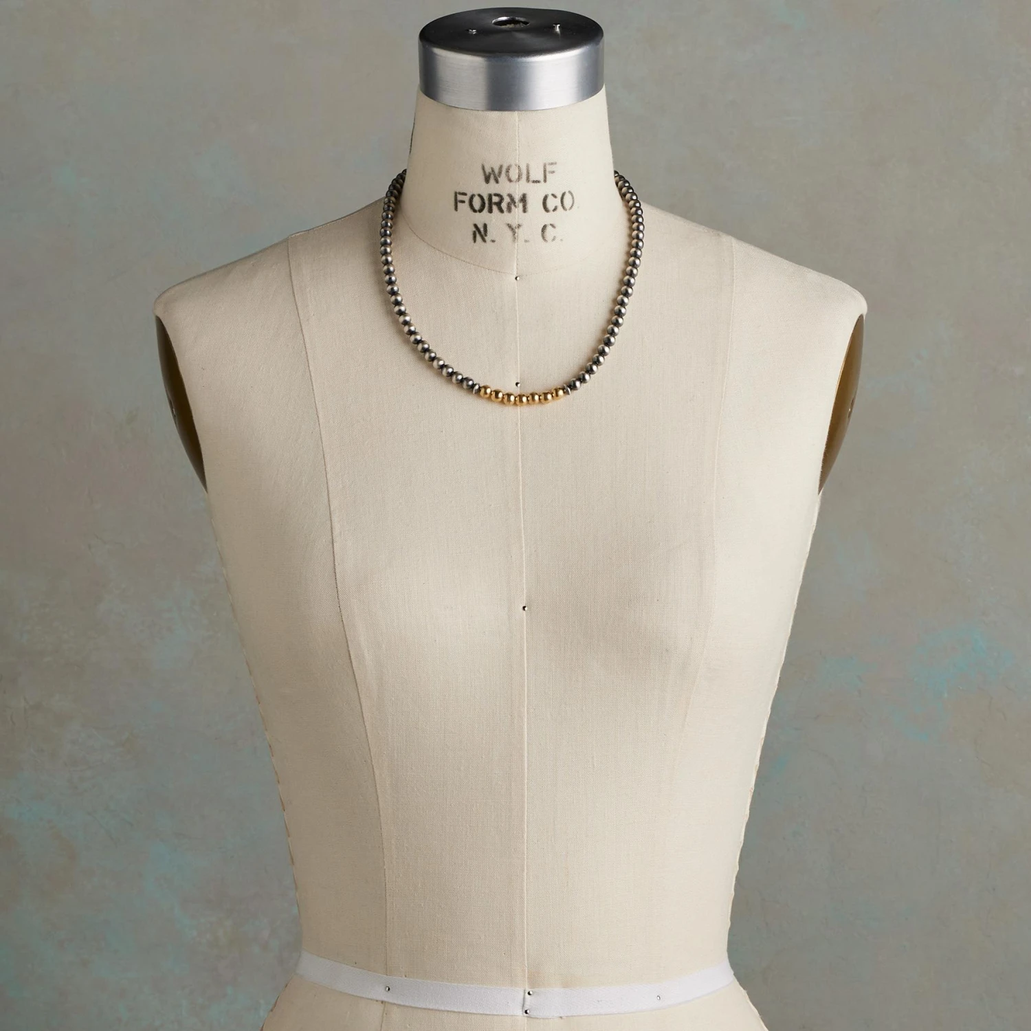 An interplay of shadow and light lends modern warmth to a classic design. Sterling silver beads—some oxidized and others gilded with 14kt gold plate—clasp with a gold-plated button. Handcrafted. Exclusive. 18″L.