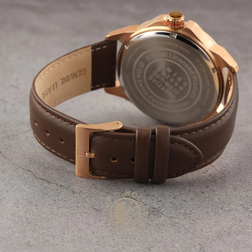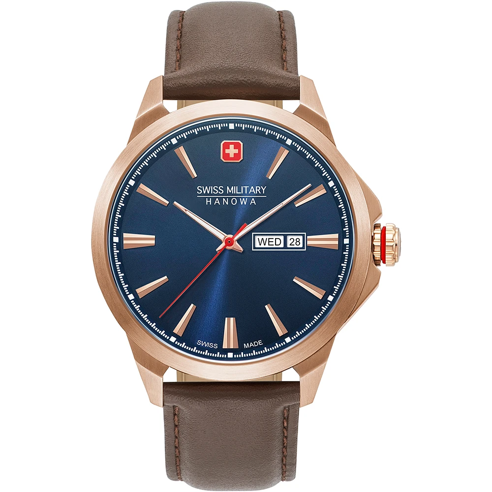 This Swiss Military Hanowa watch has a case made of stainless steel with a diameter of 45 mm and is fitted with a leather band. Inside the case lies a Ronda movement and the watch features a Sapphire crystal.