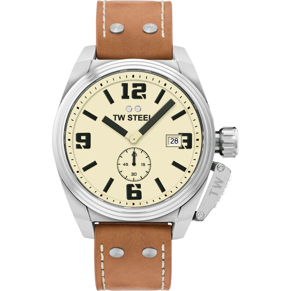 This TW Steel watch has a case made of stainless steel with a diameter of 42 mm and is fitted with a leather band. Inside the case lies a Ronda movement and the watch features a Sapphire crystal.
