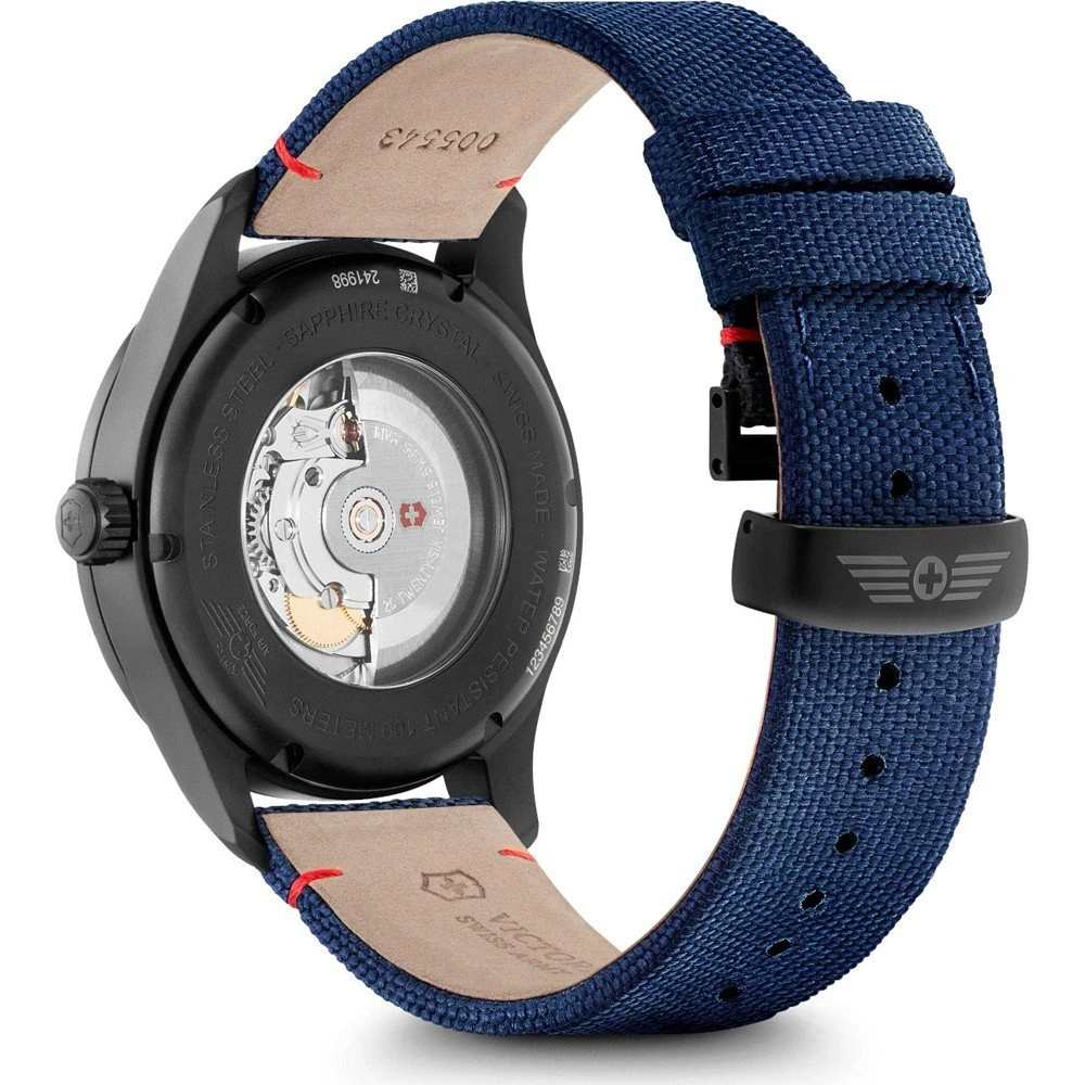 This Victorinox Swiss Army watch has a case made of stainless steel with a diameter of 42 mm and is fitted with a textile band. Inside the case lies a Sellita movement and the watch features a Sapphire crystal.