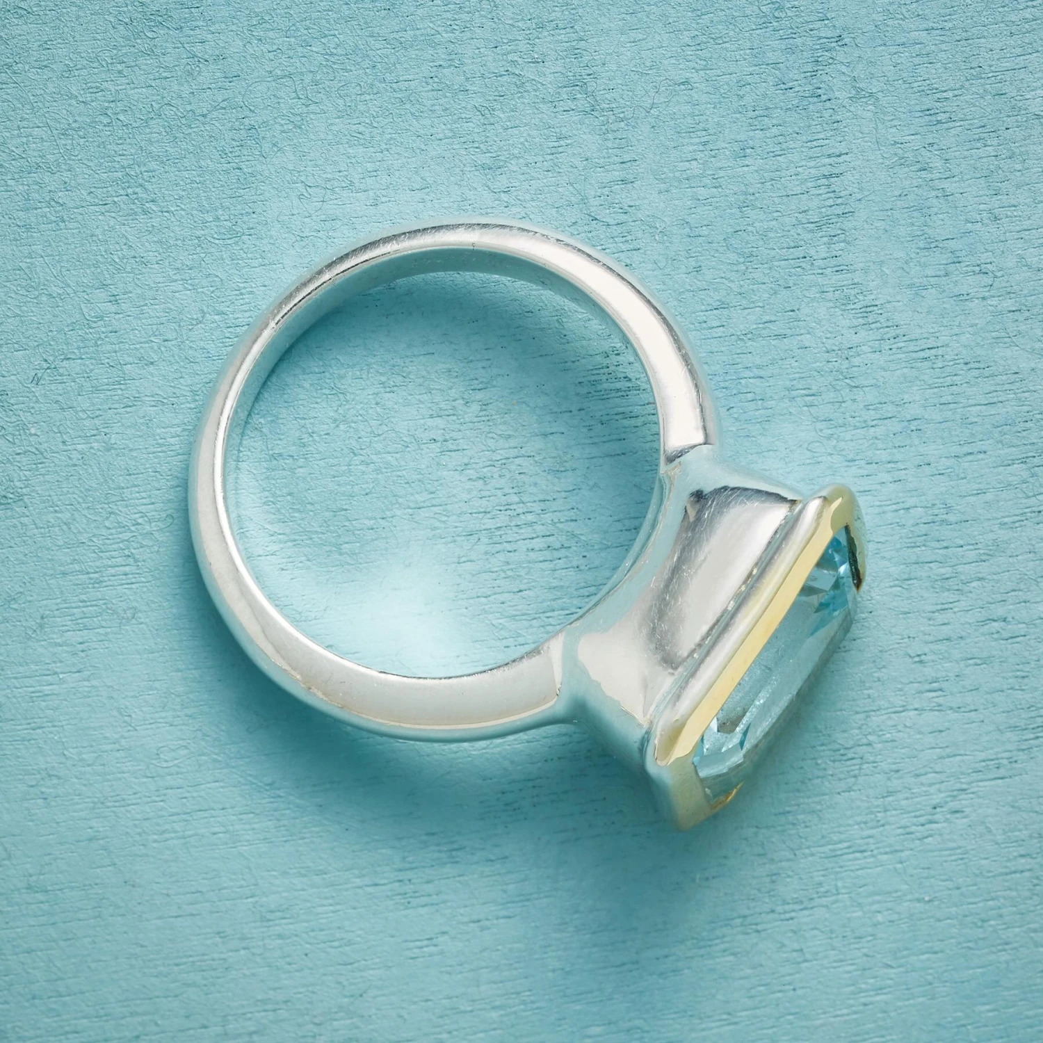 Facets recede into the seemingly endless depths of a stately blue topaz rimmed in 14kt gold plate. Sterling silver bezel and band. Exclusive. Whole sizes 5 to 9.