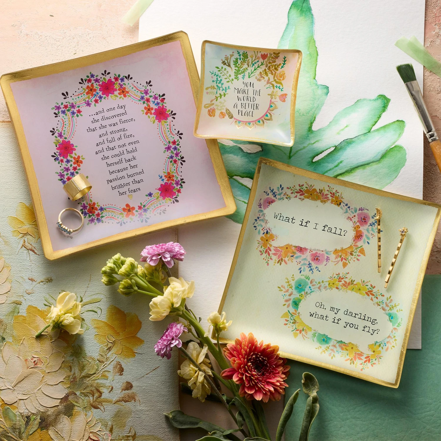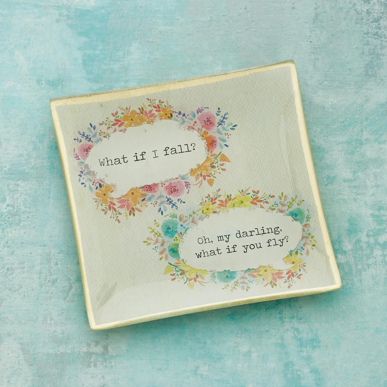 A sweet, handcrafted glass dish with gold accents, that’s a gift of love, friendship and encouragement for those near and dear. Imported. 6″ sq.